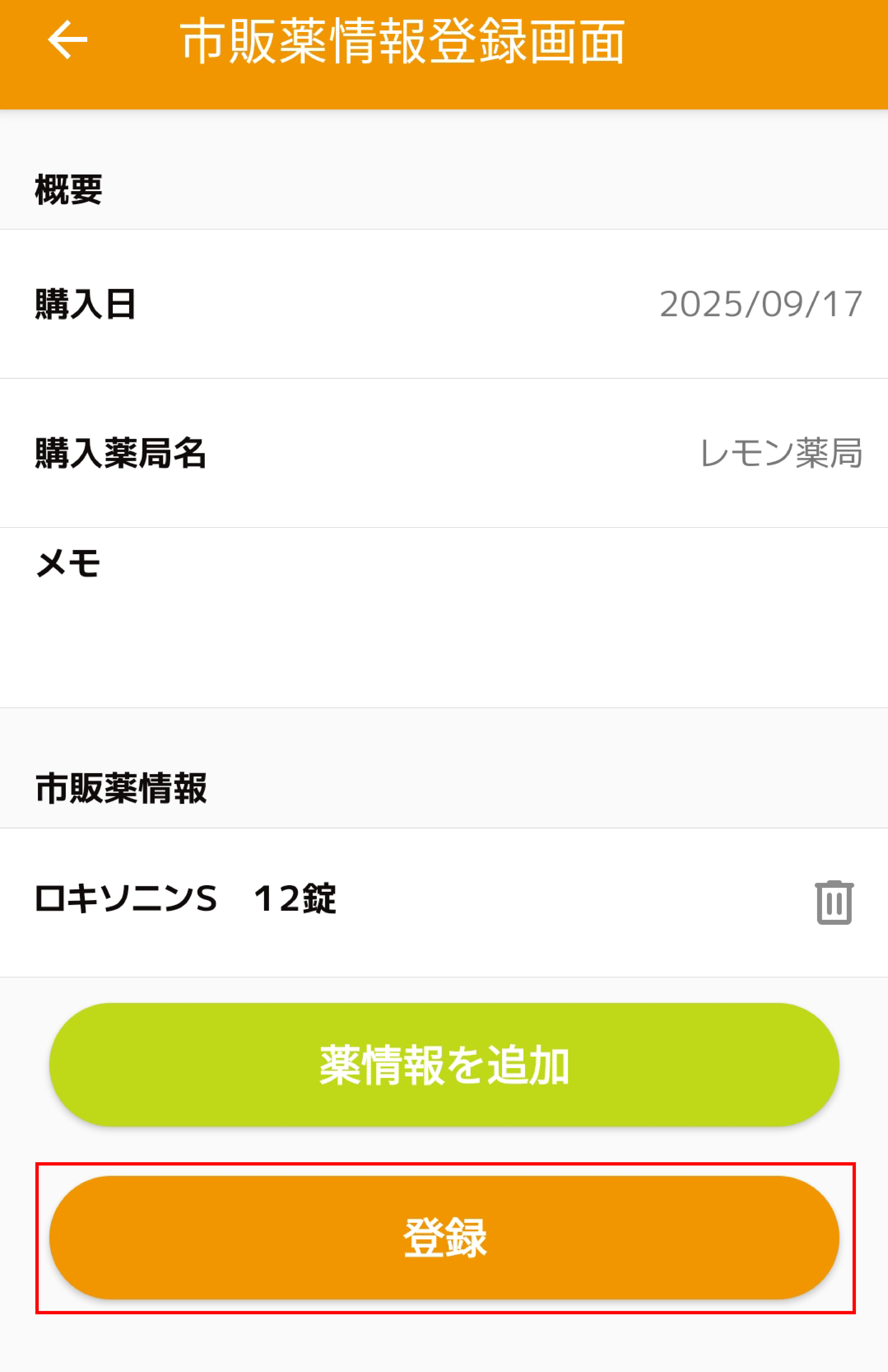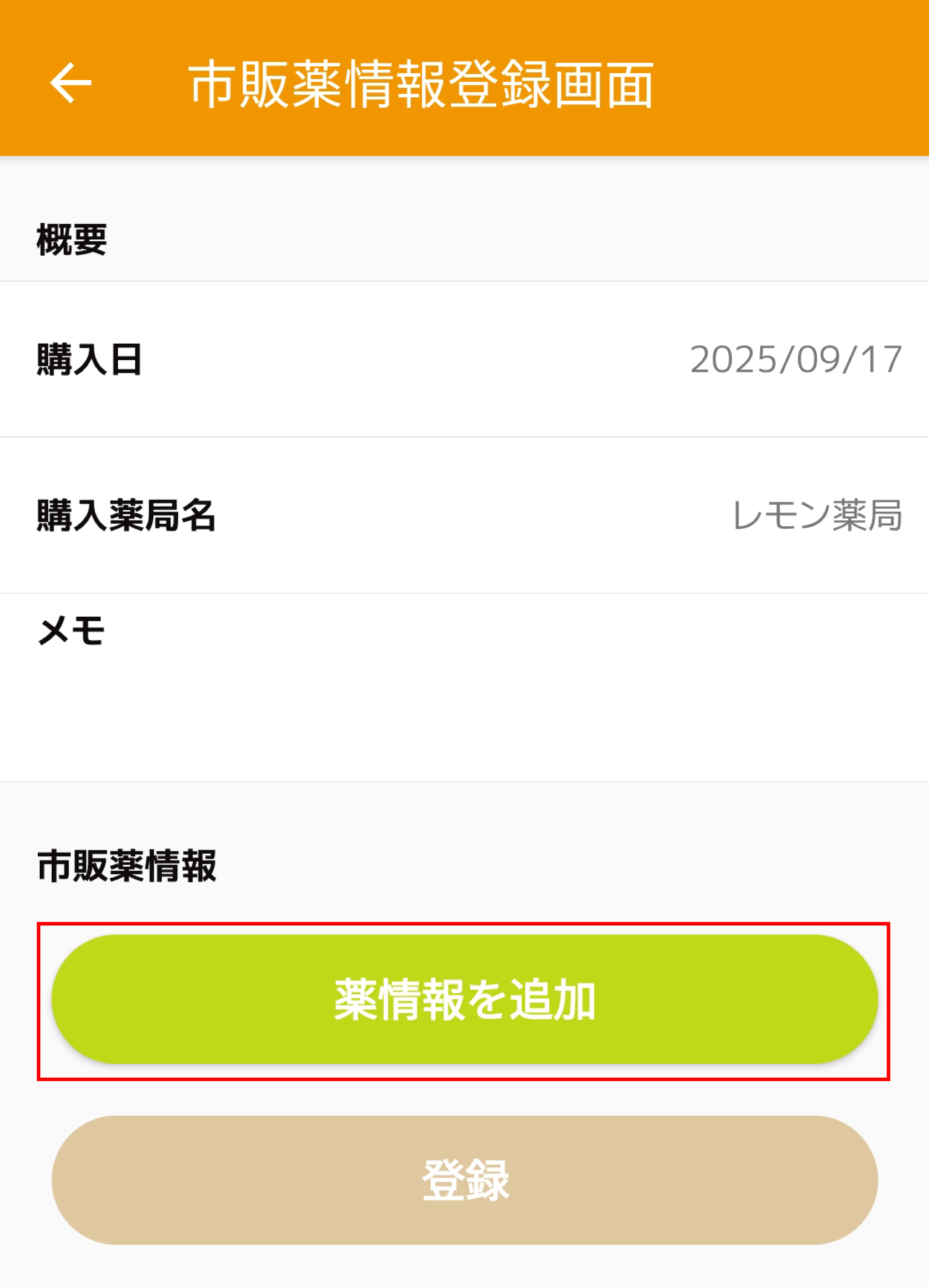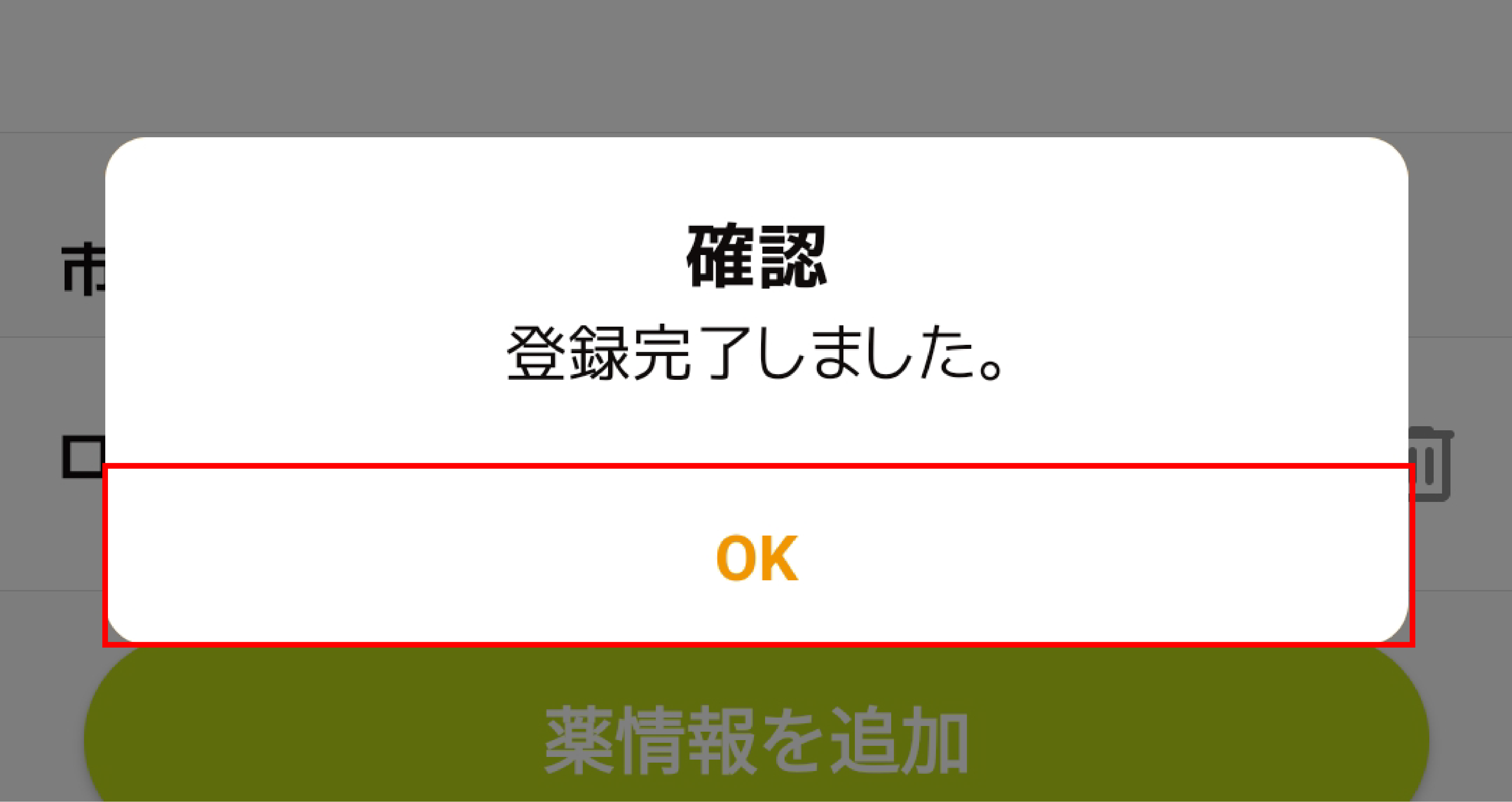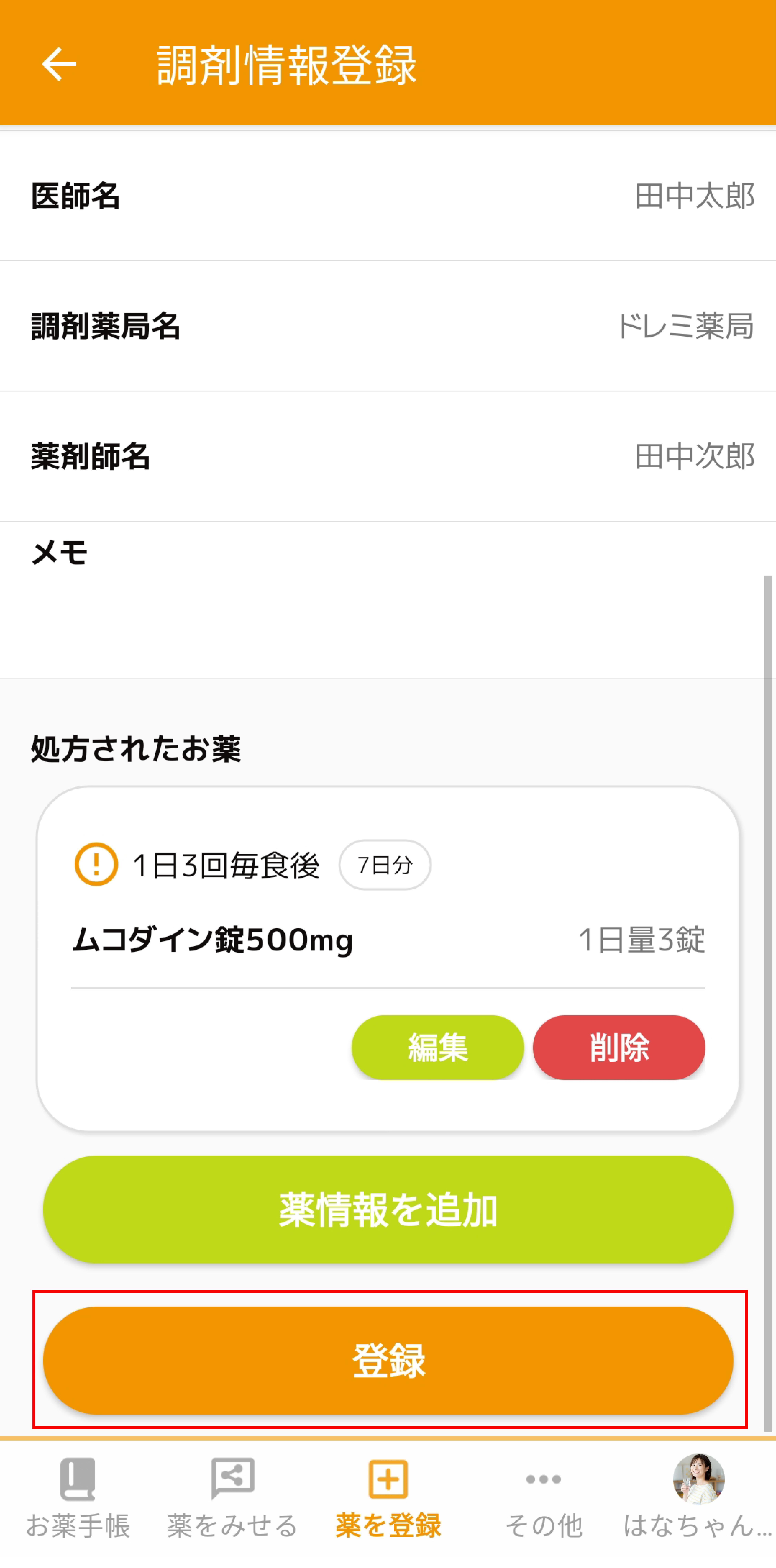 薬情報の追加ができると「登録」がタップできる様になるので、