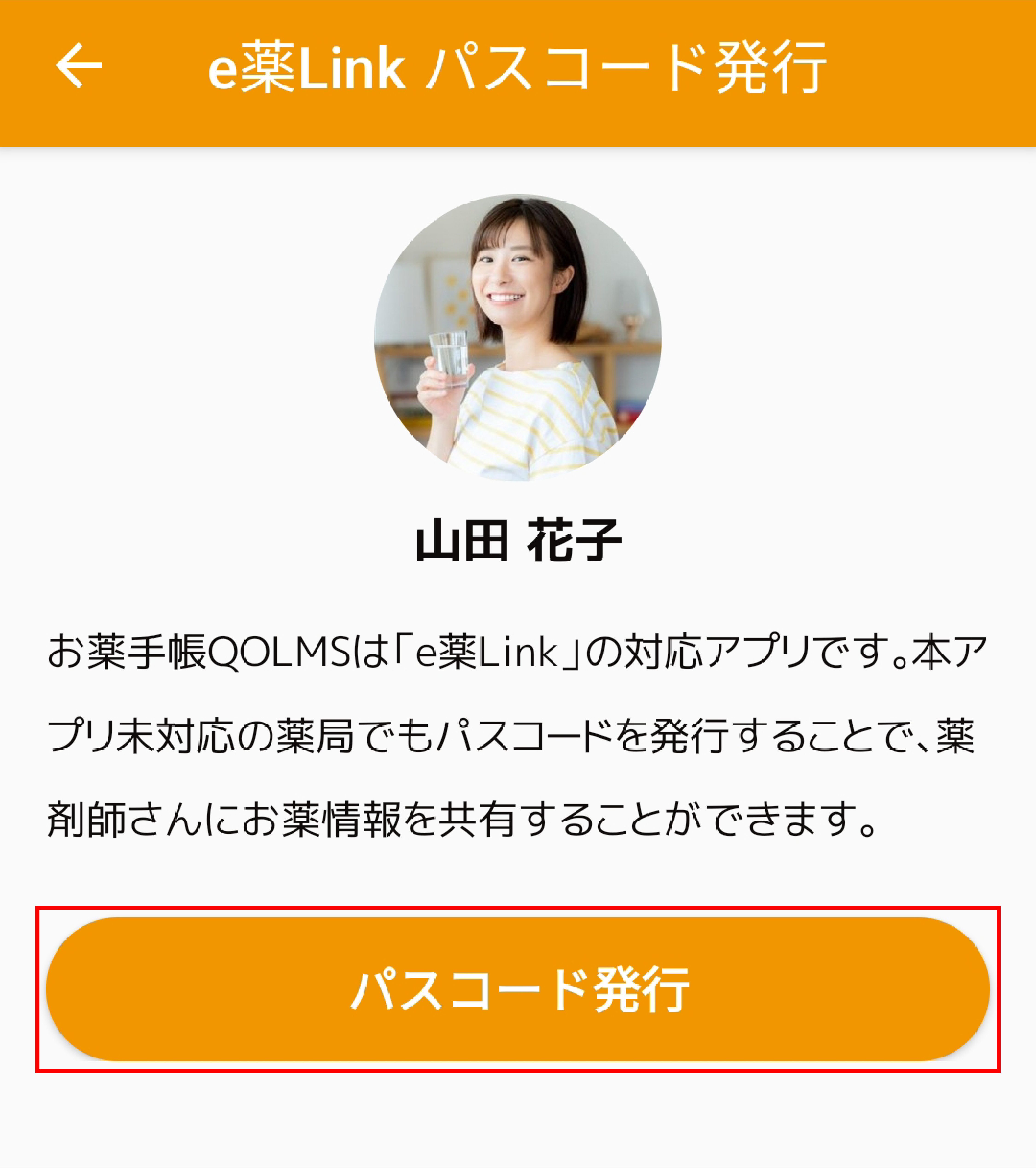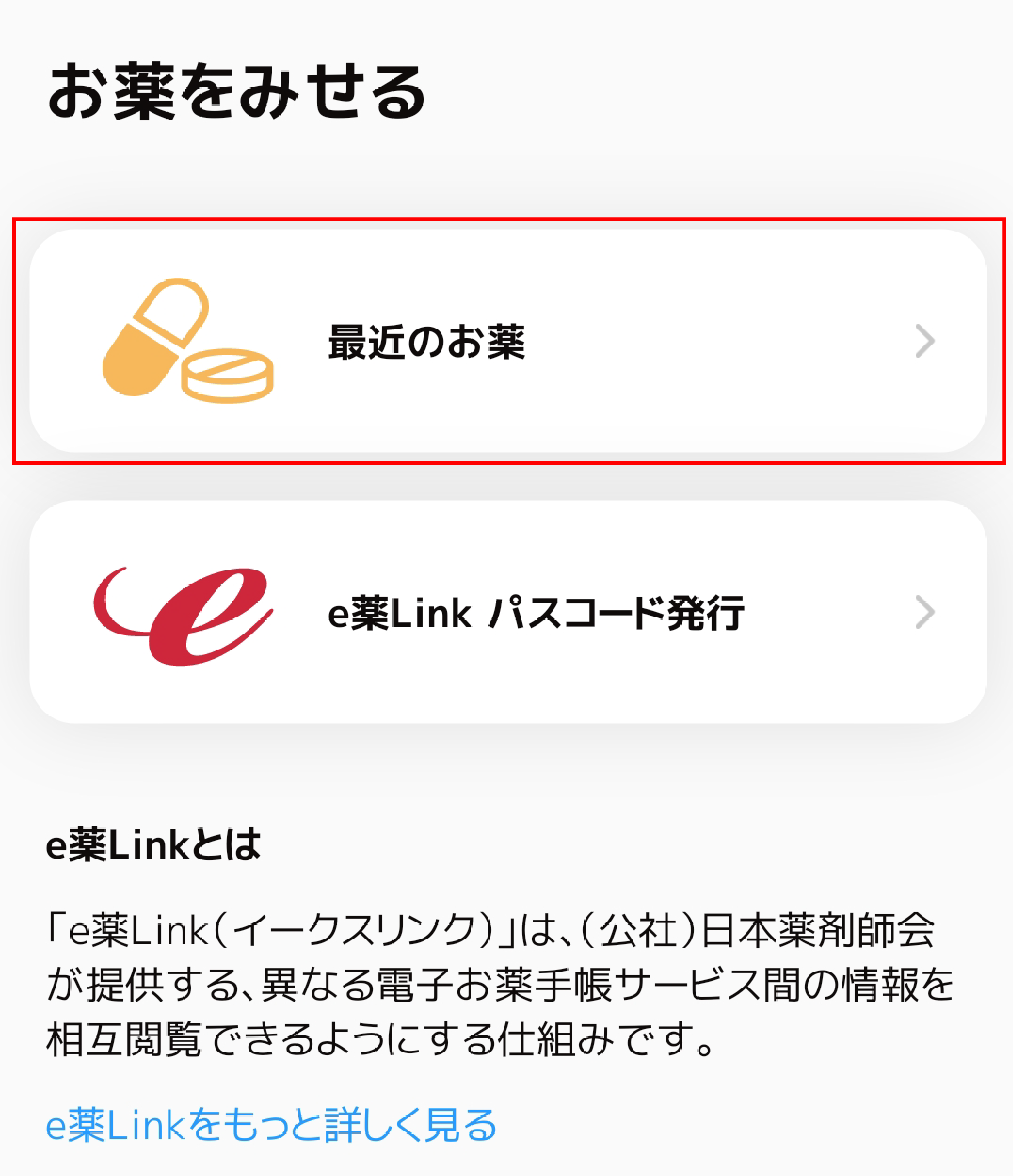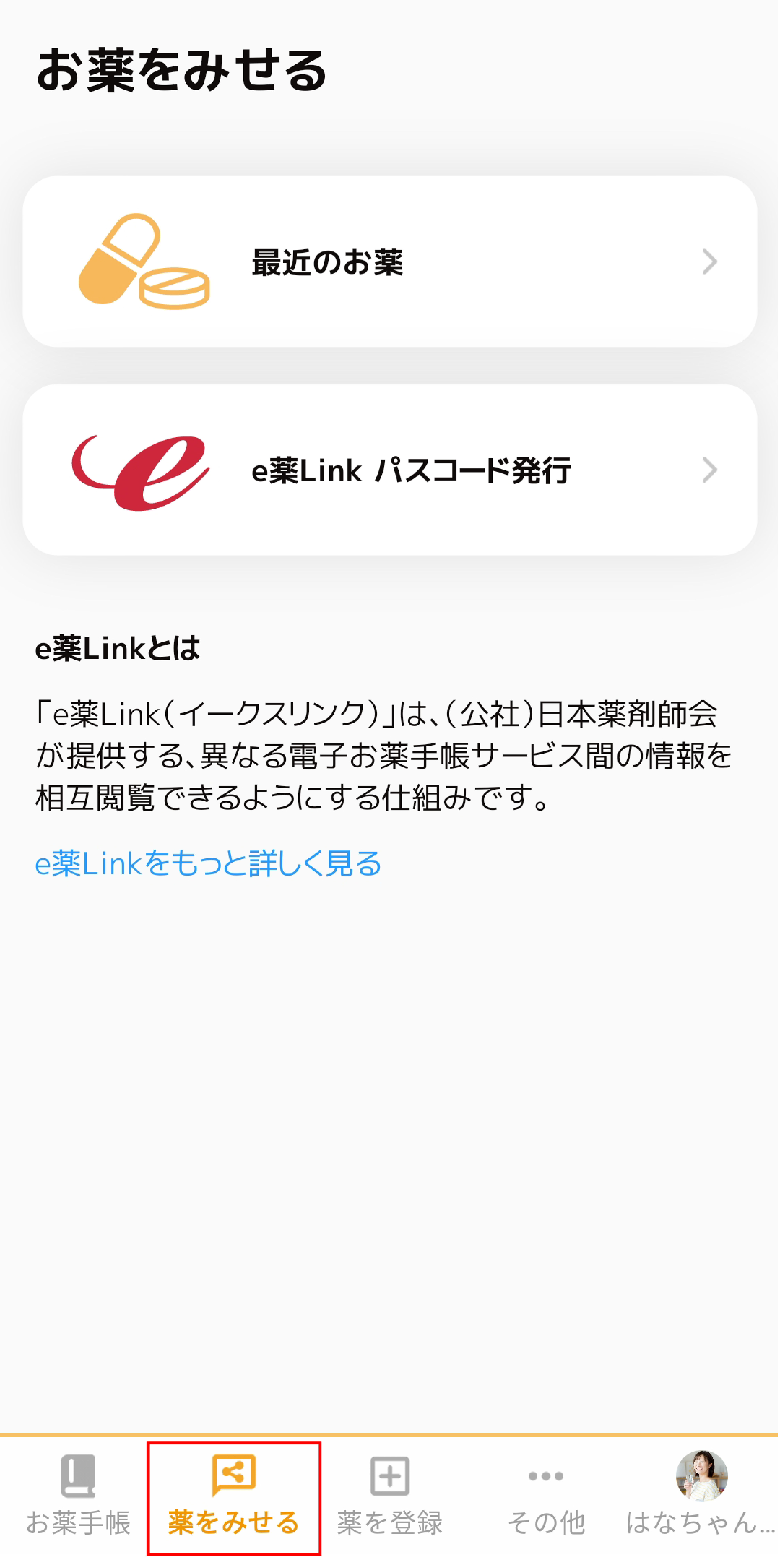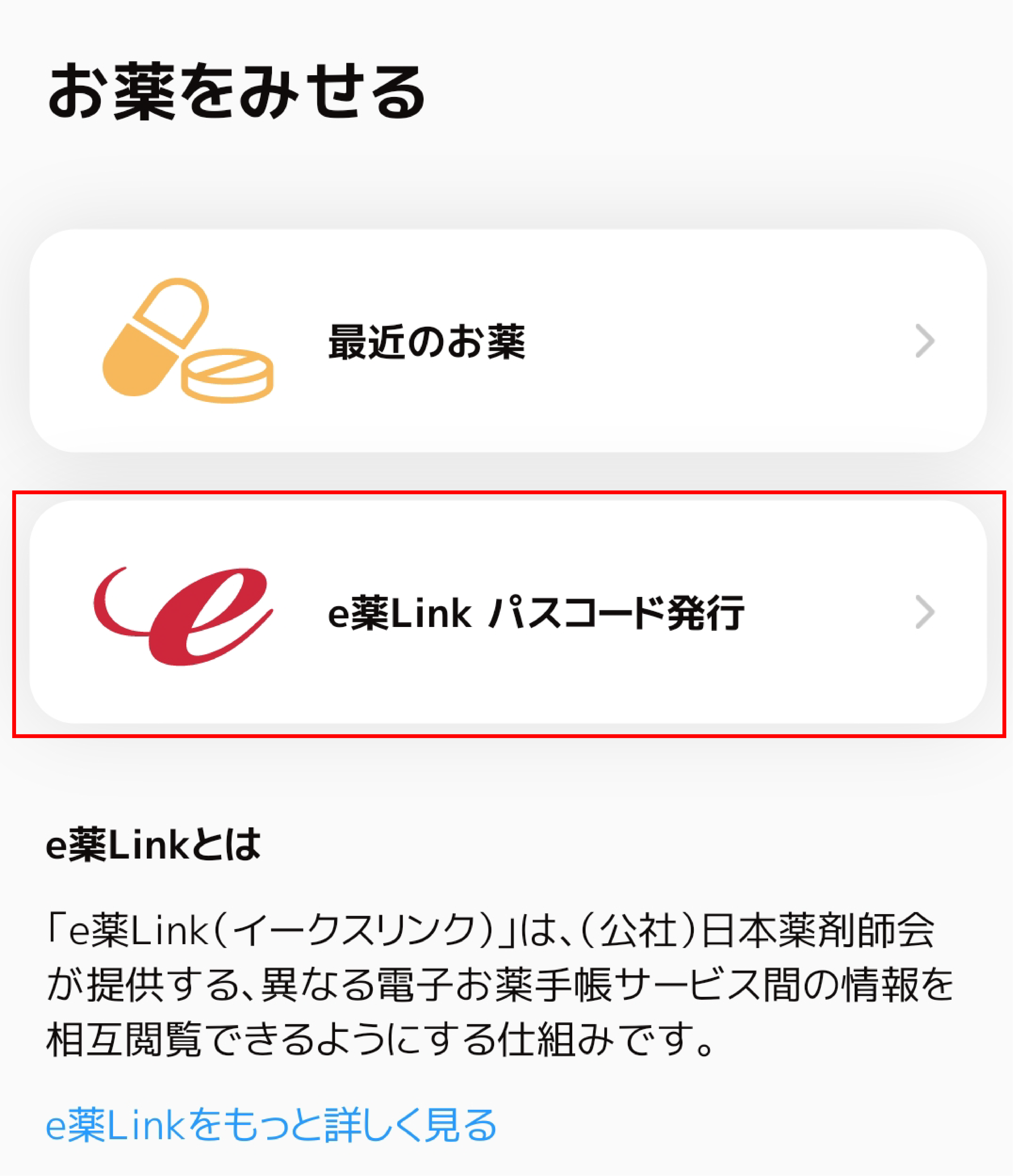 お薬をみせるメニューの「e薬Link パスコード発行」をタップします。