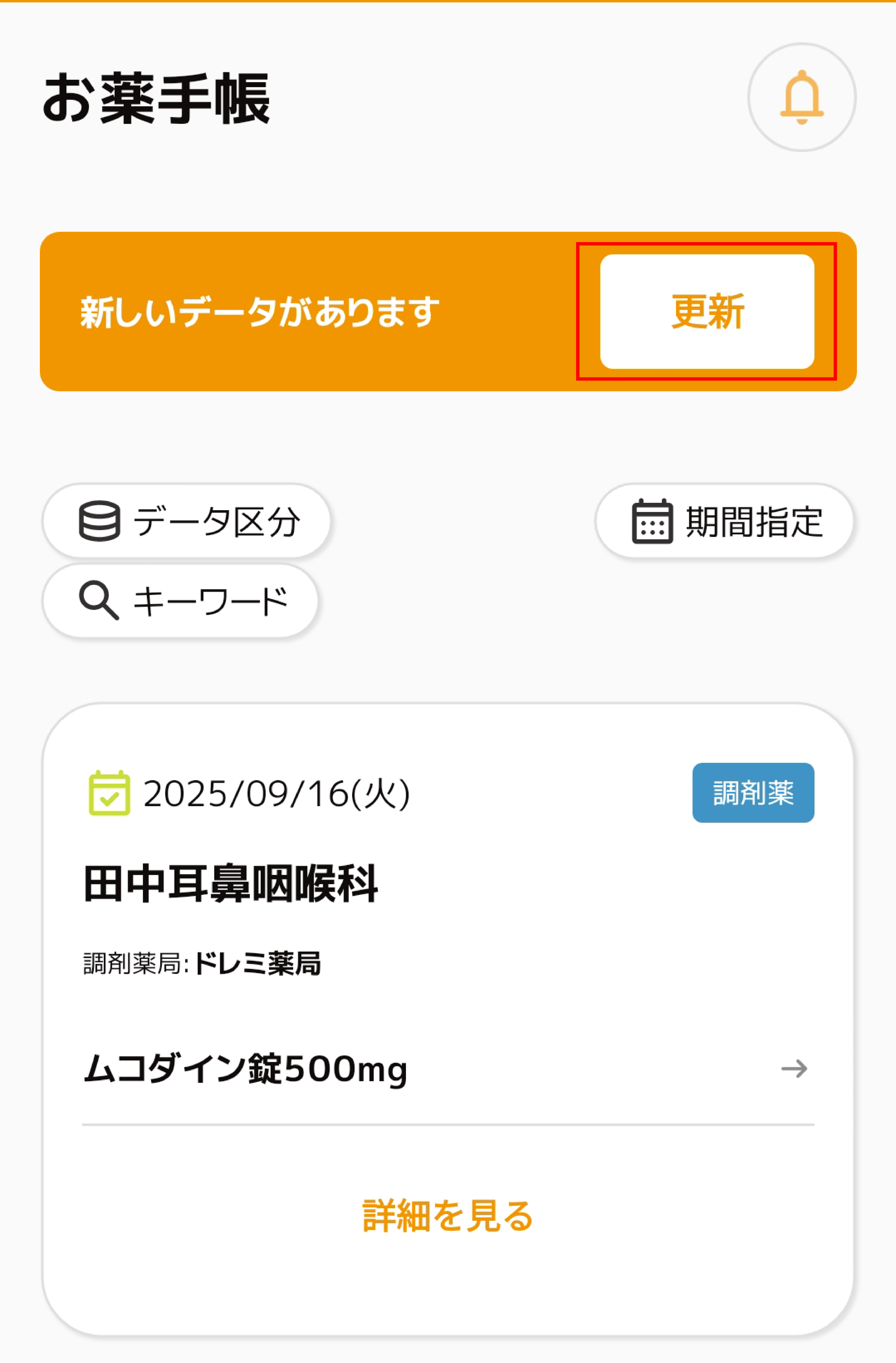 お薬手帳上に更新ボタンが表示され、更新ボタンをタップすると手帳内データが更新されます。