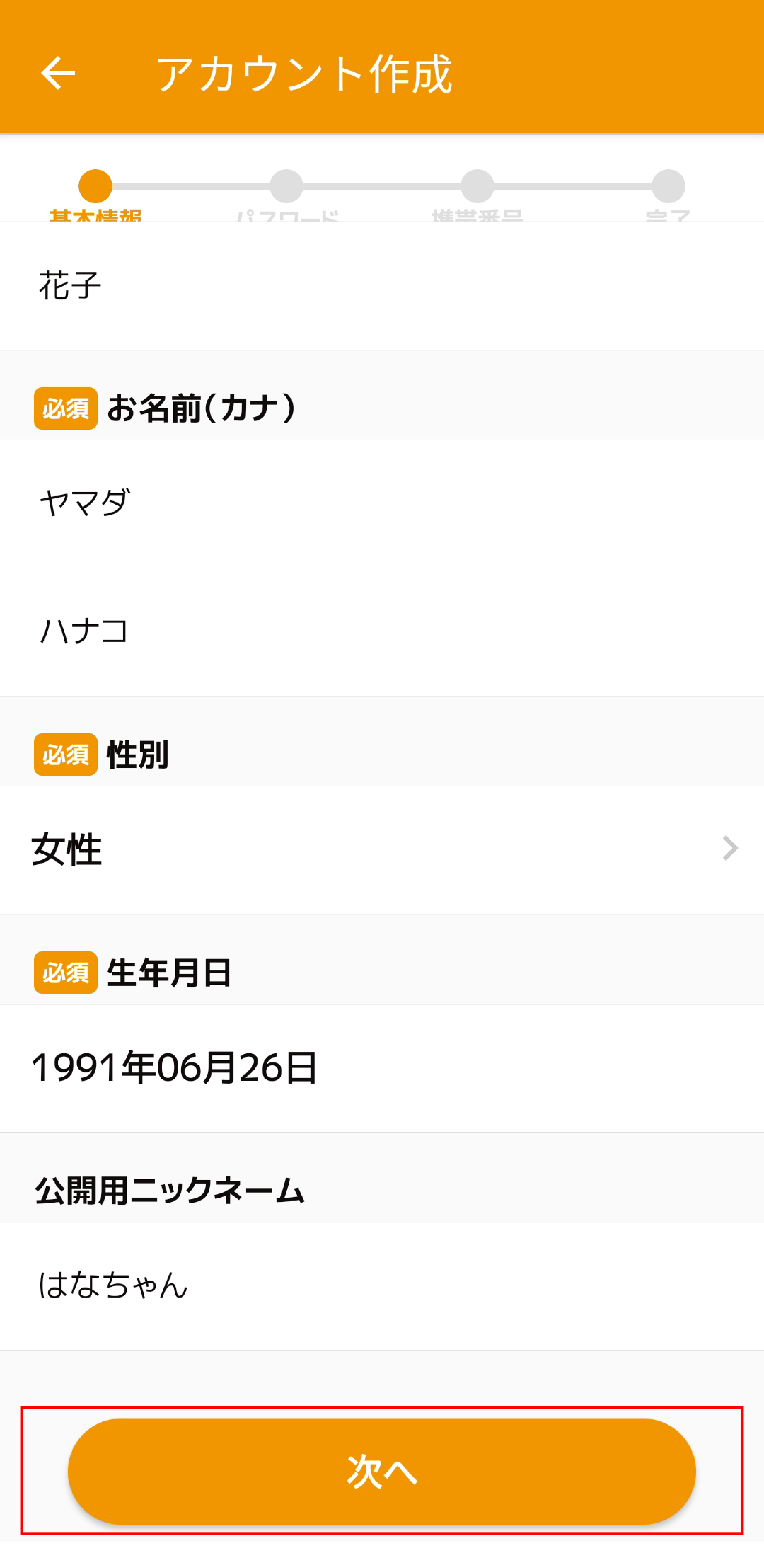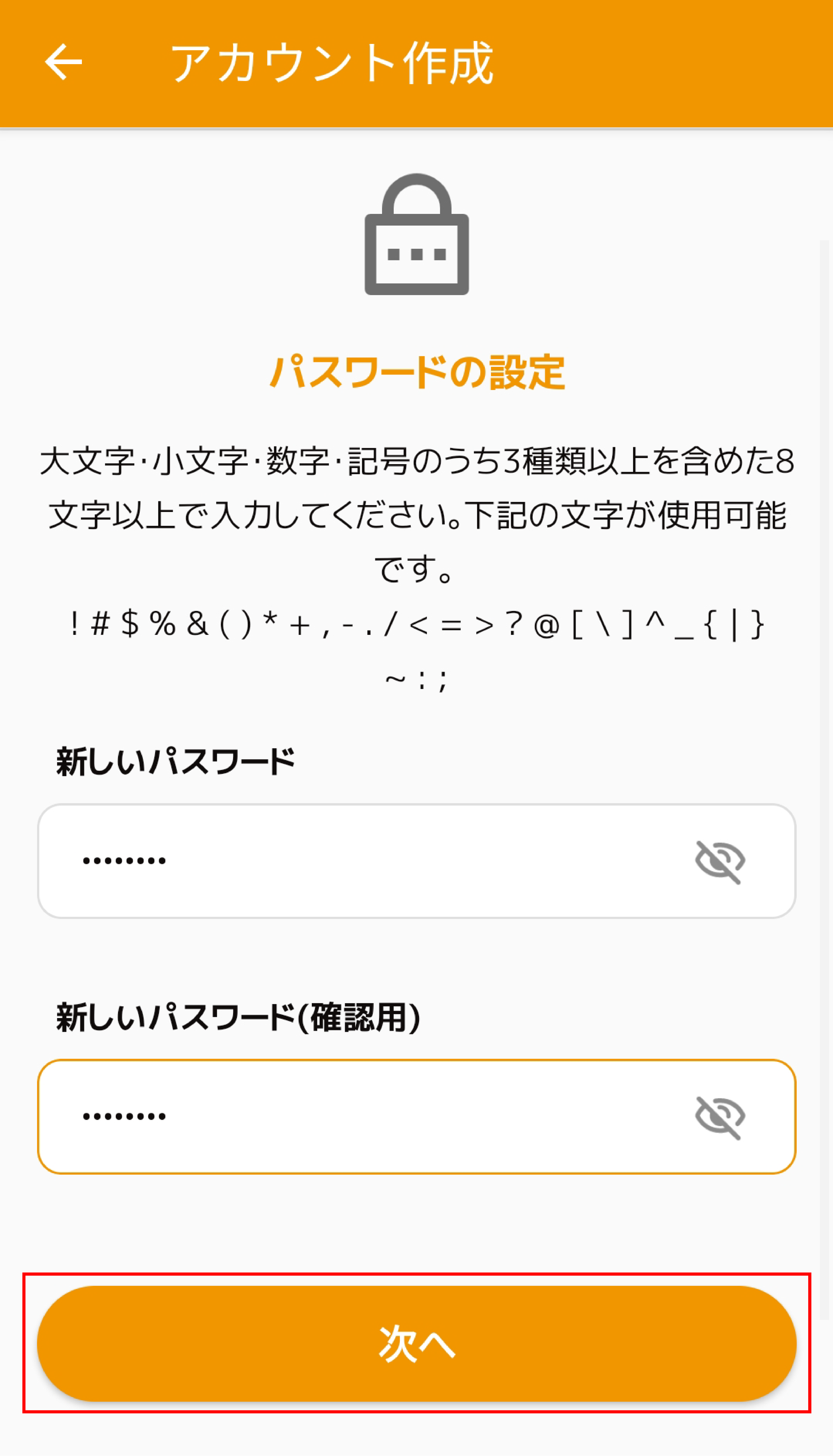 8文字以上で入力して、「次へ」が活性化されたらタップします。