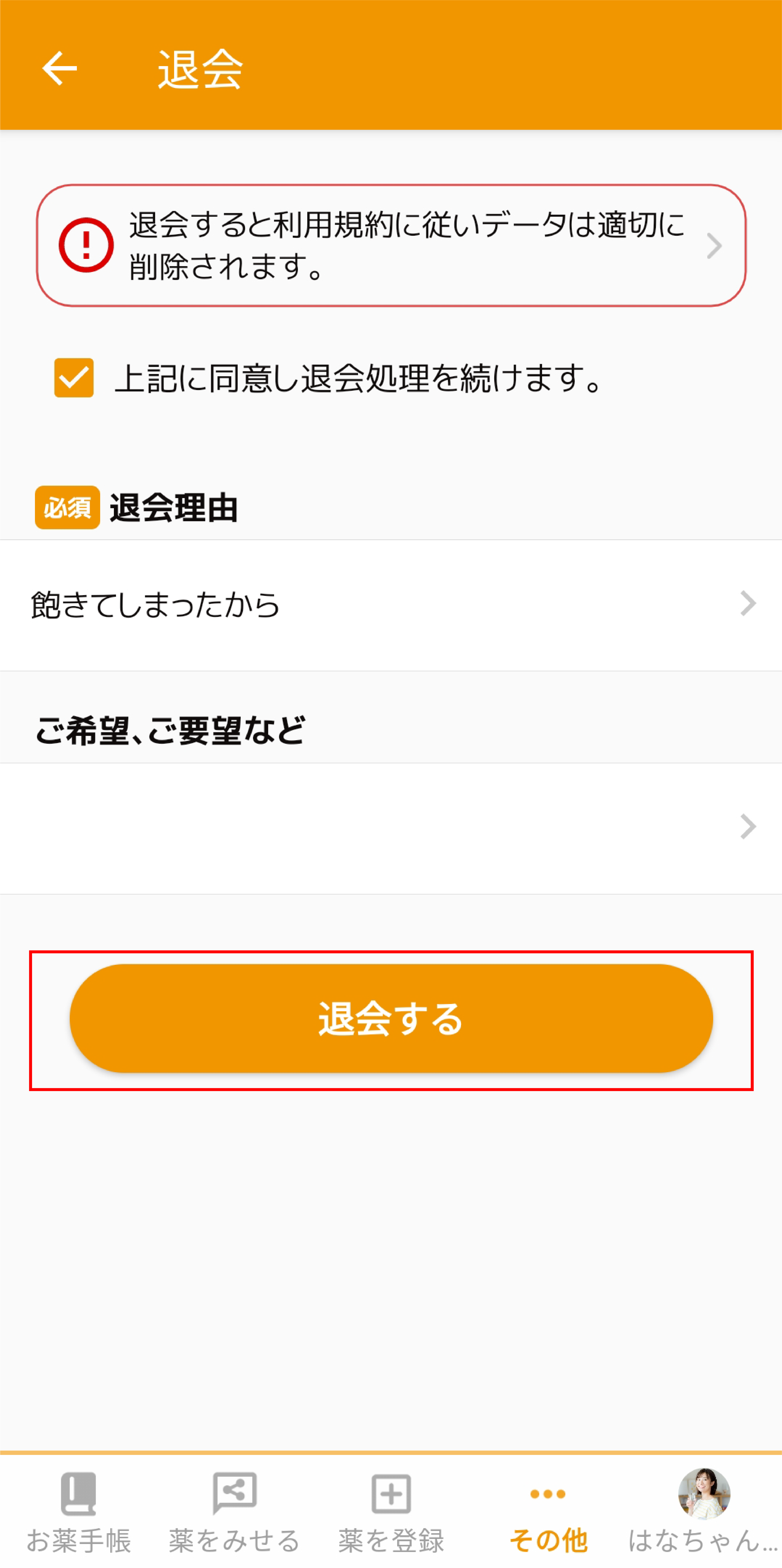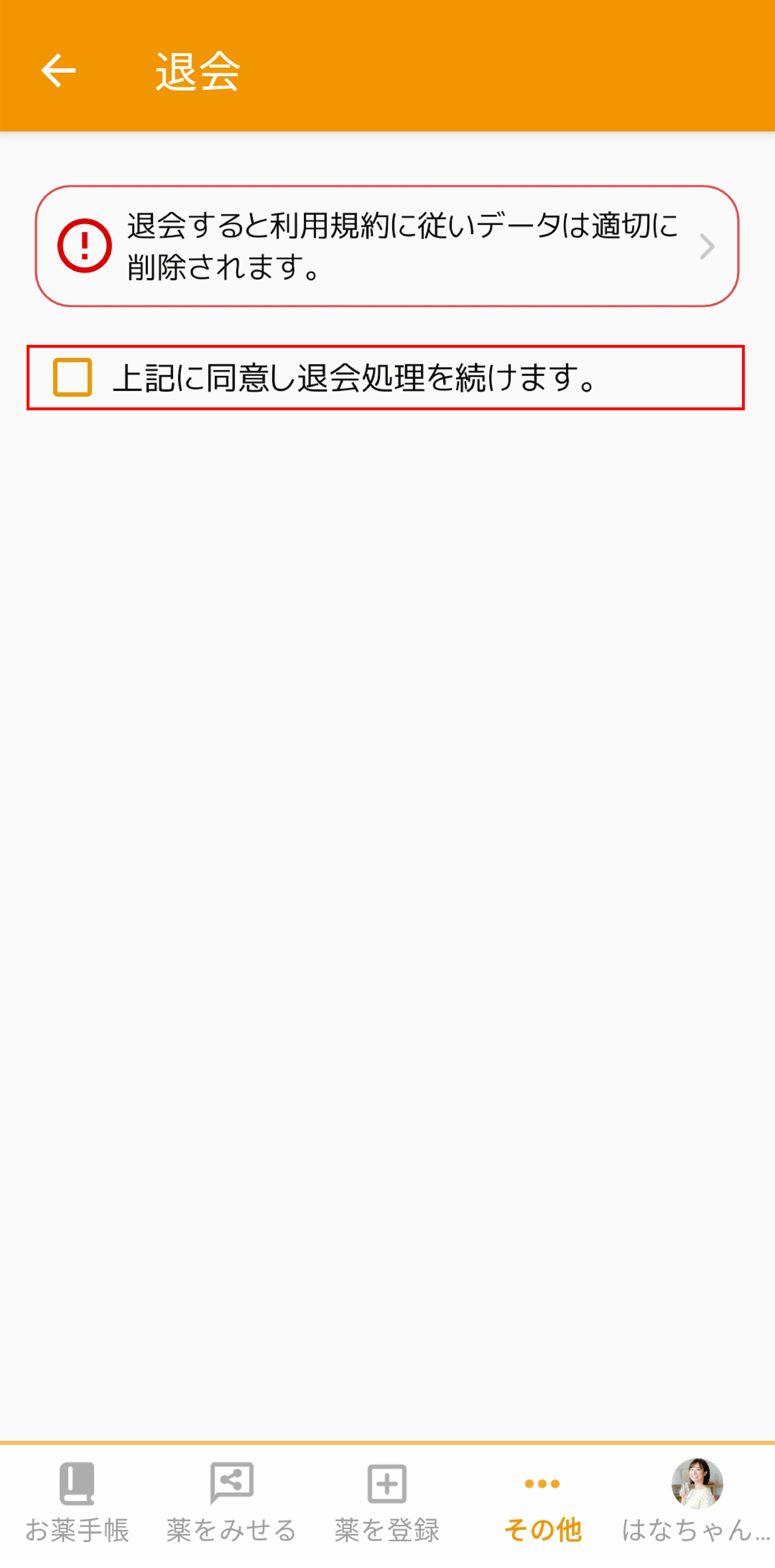 注意文言を読み、上記に同意し退会処理を続けますのチェックボックスにチェックを入れ