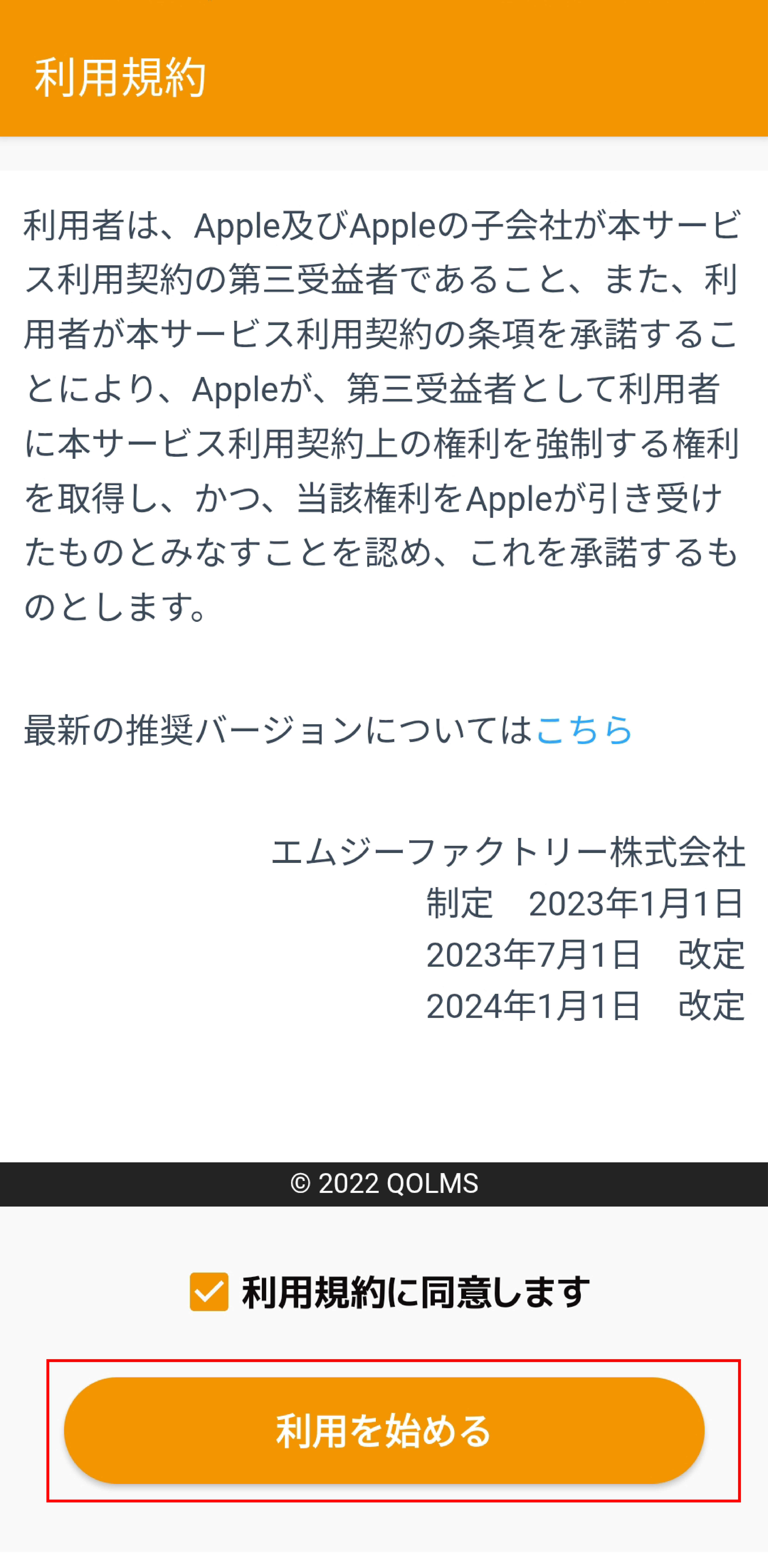 利用規約を読み、利用規約に同意しますのチェックボックスにチェックを入れ
