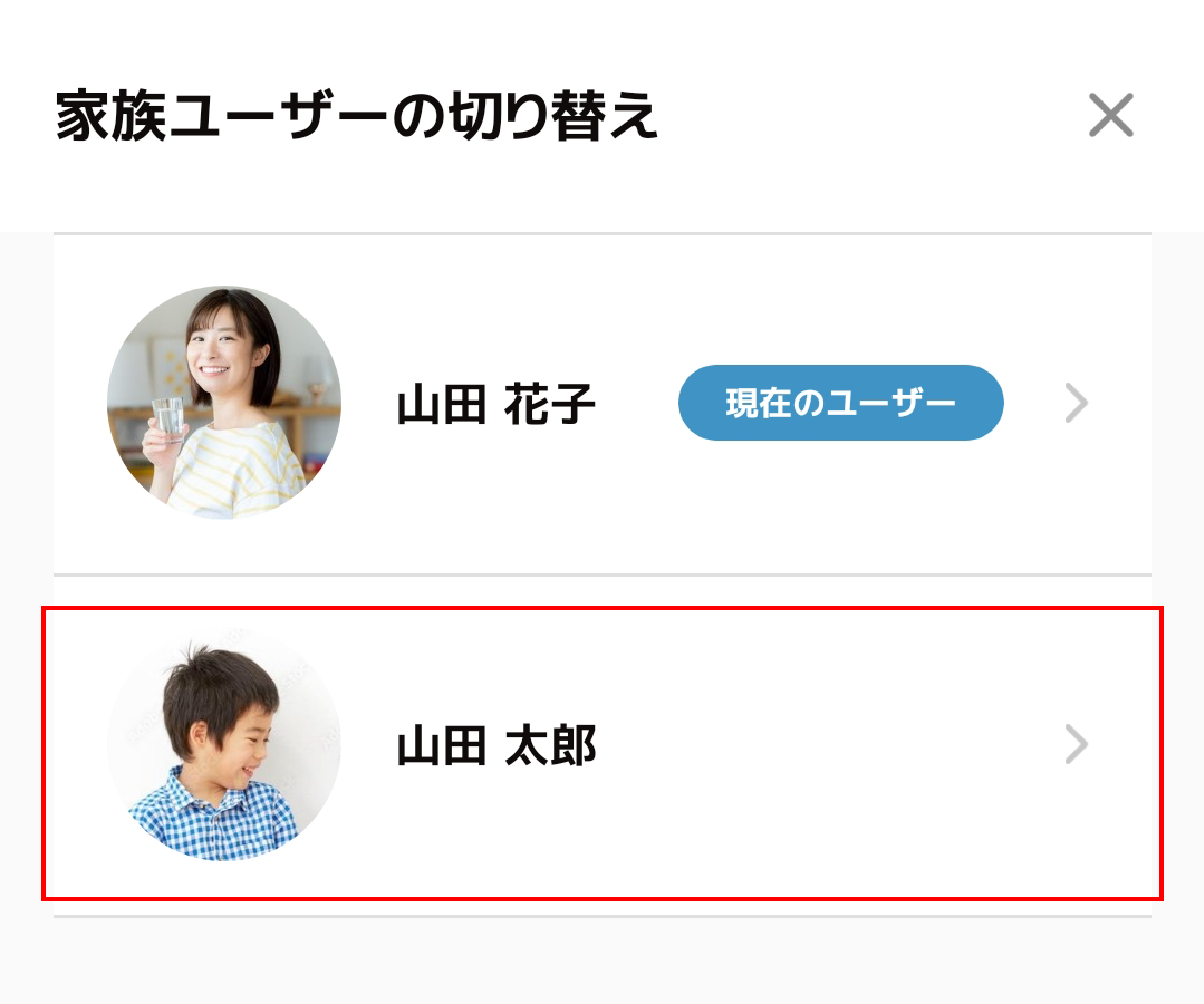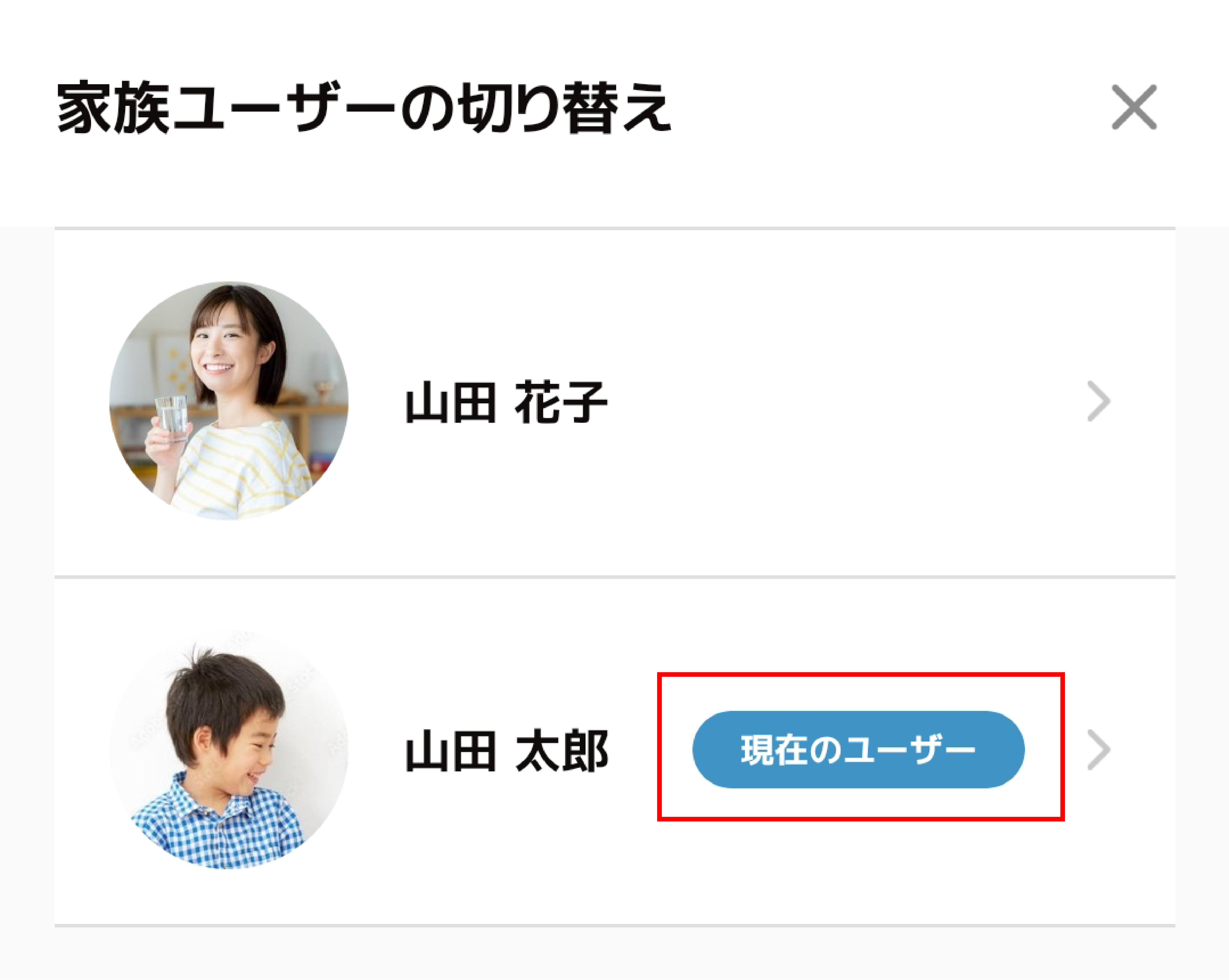 もしくは家族ユーザー切り替え画面の「現在のユーザー』の表示で確認可能です。