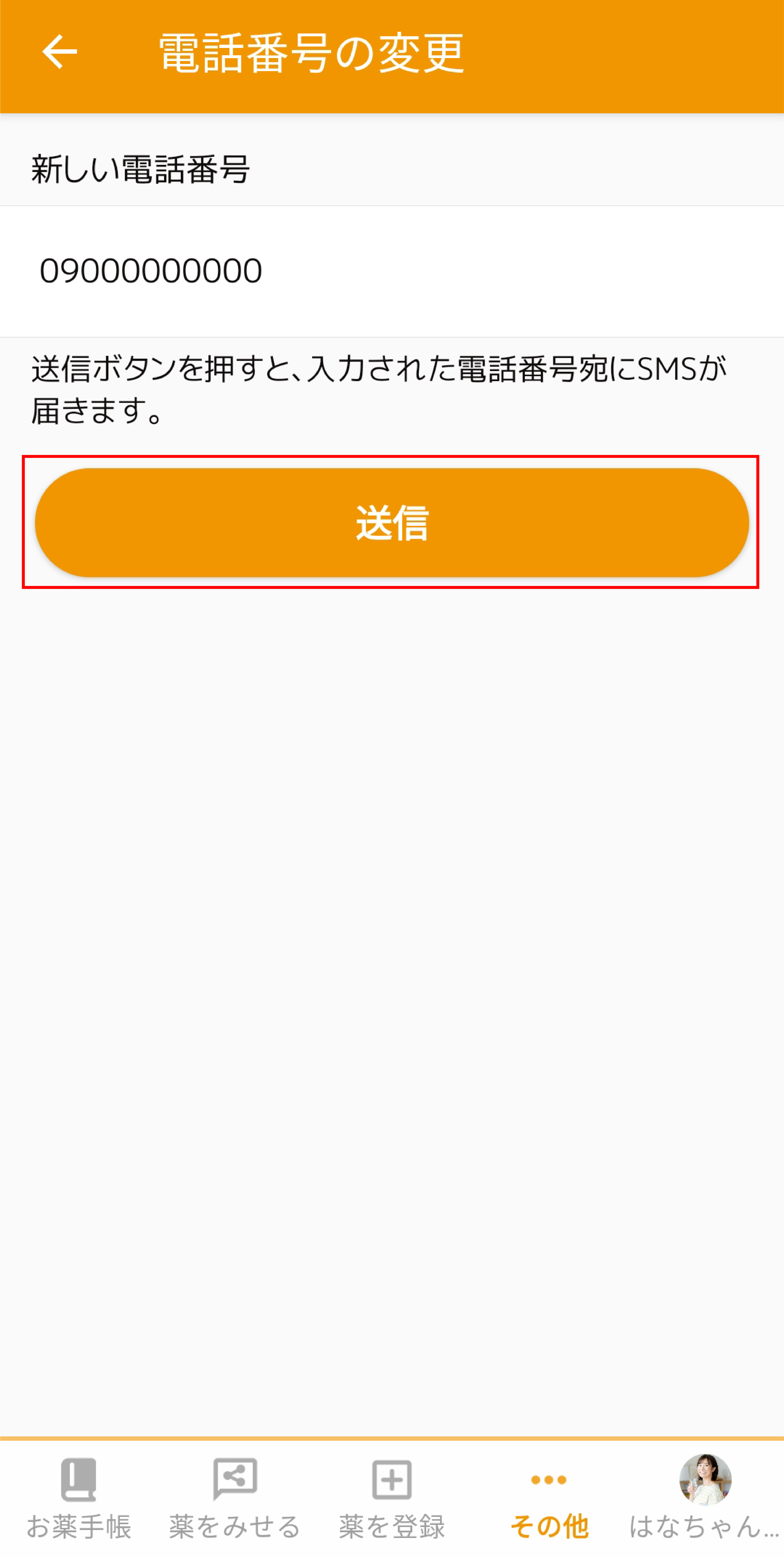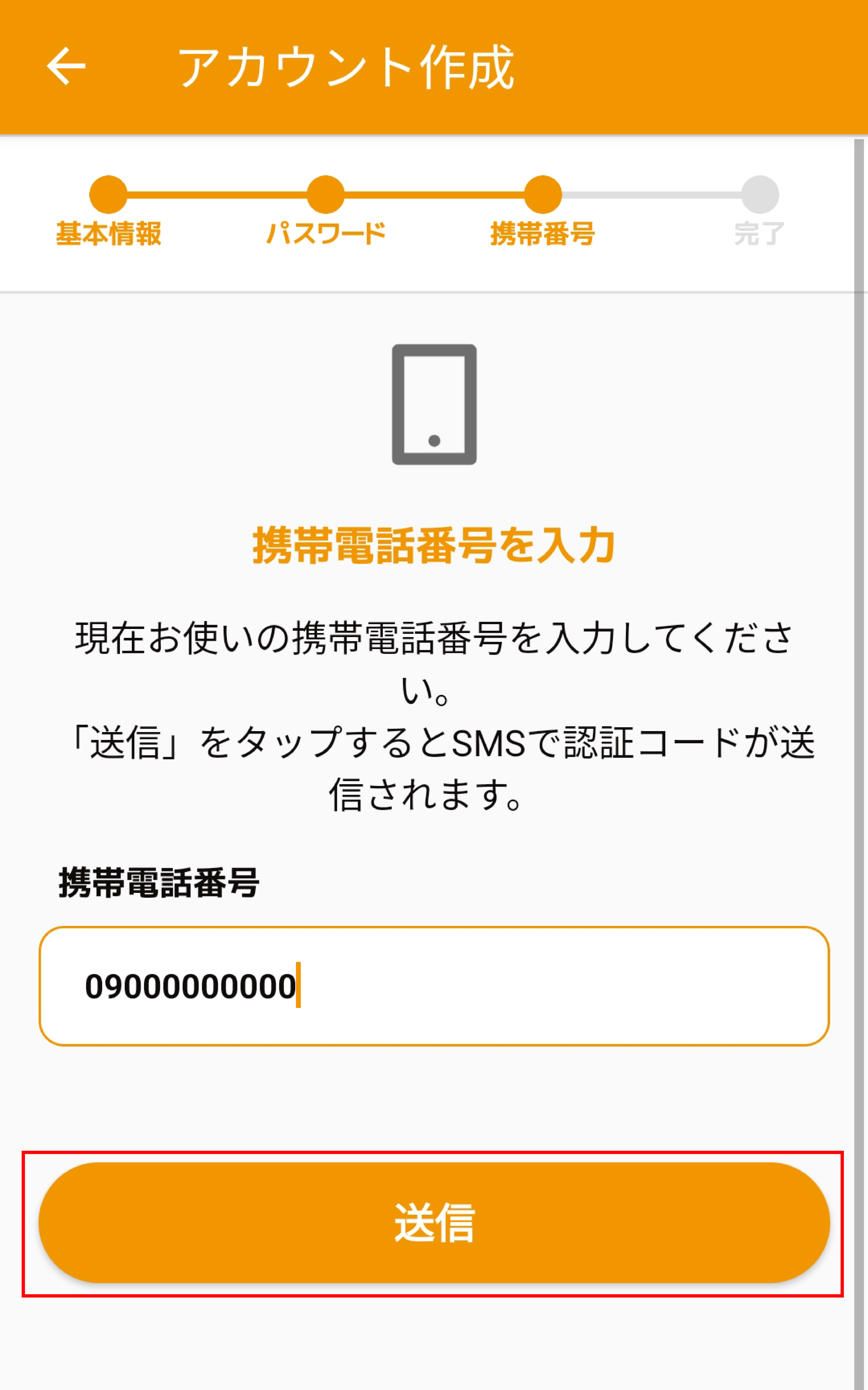 SMSを受信可能な携帯番号を入力して「送信」をタップします。
