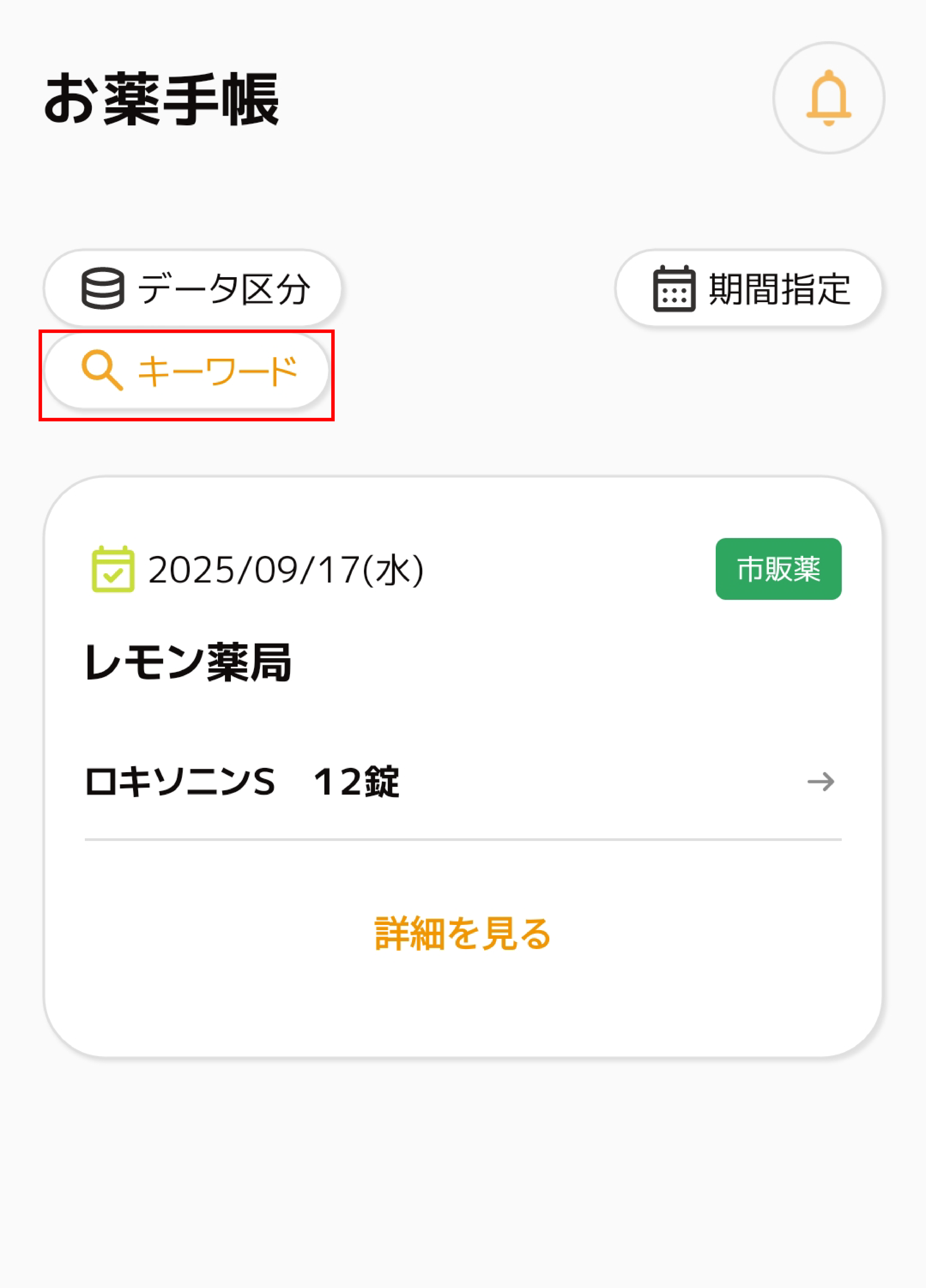 市販薬の検索画面で登録したい市販薬名を入力し検索をする。