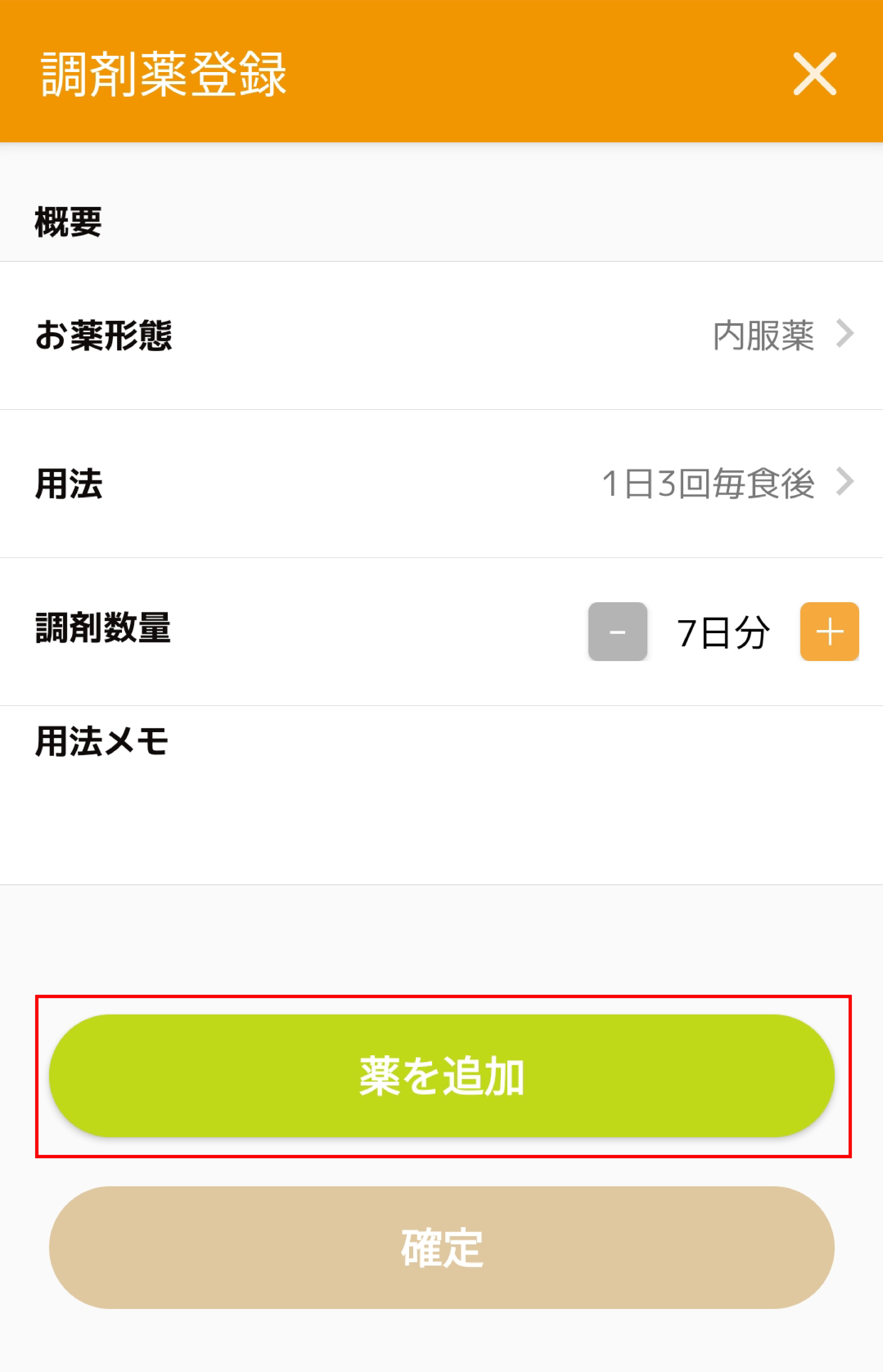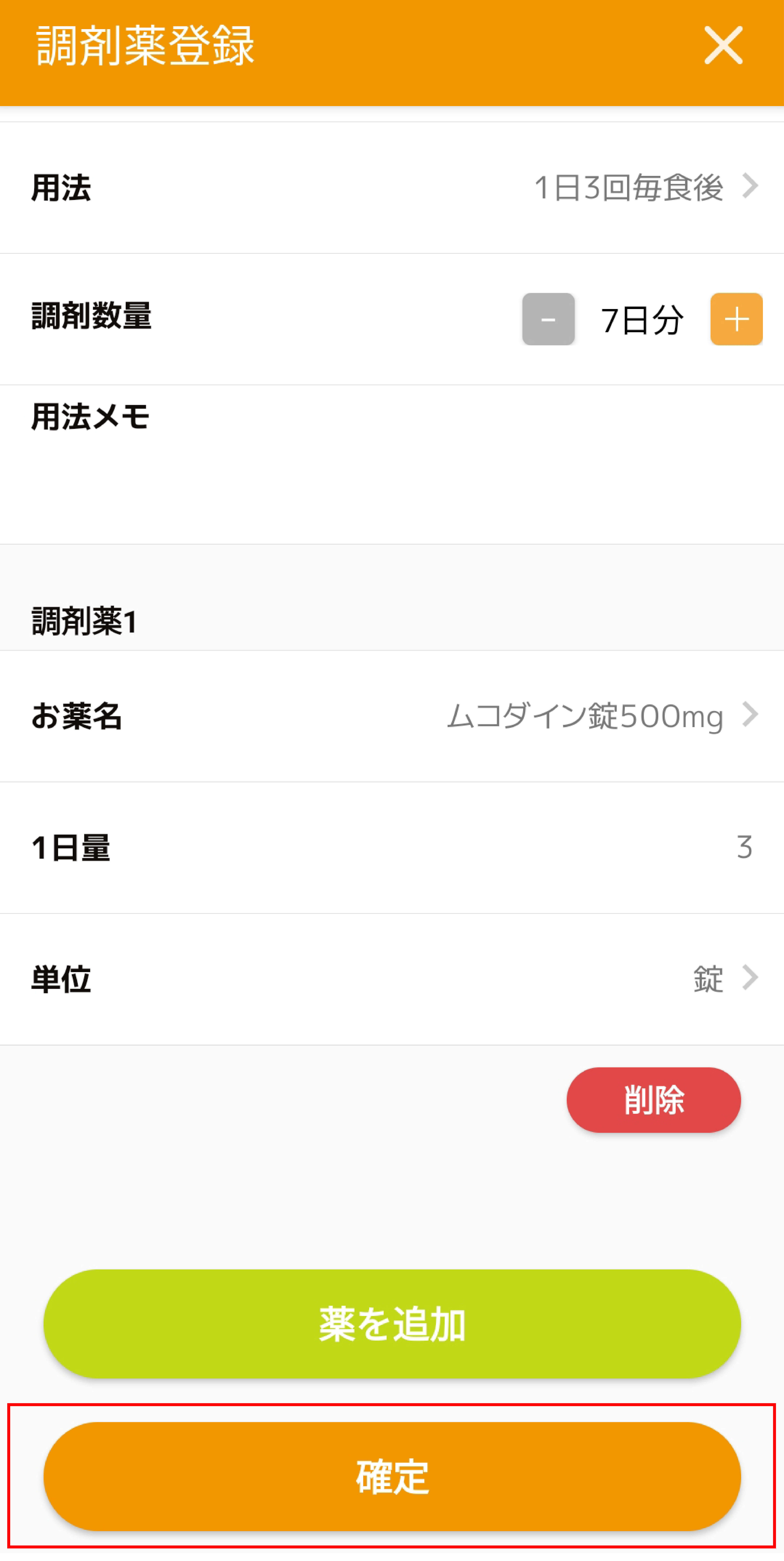 あわせて、処方された数量と単位を入力し「確定」をタップします。