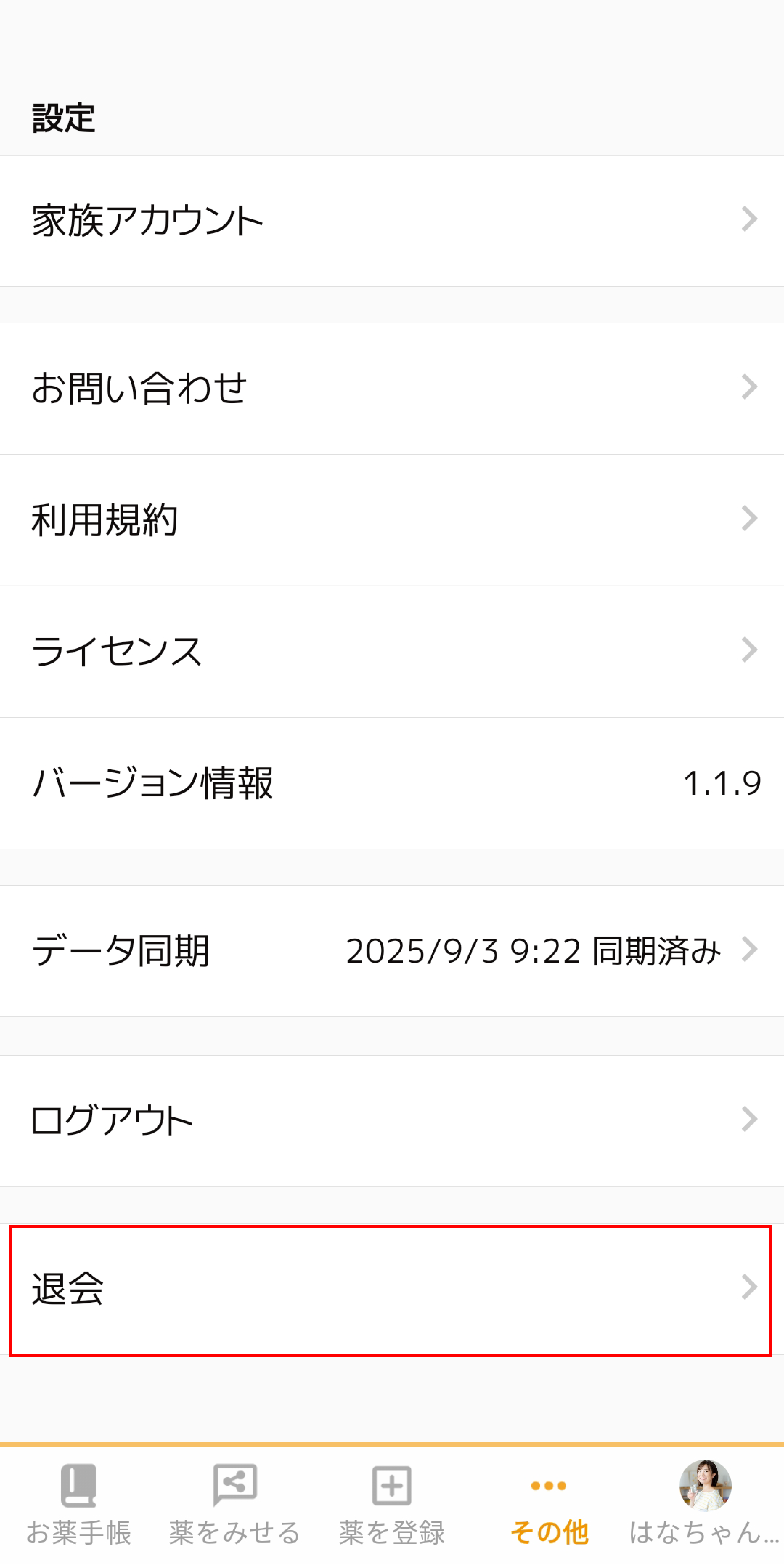 お薬手帳QOLMSだけ利用を止めたい場合は「ログアウト」とアプリの「アンインストール」を実施ください。