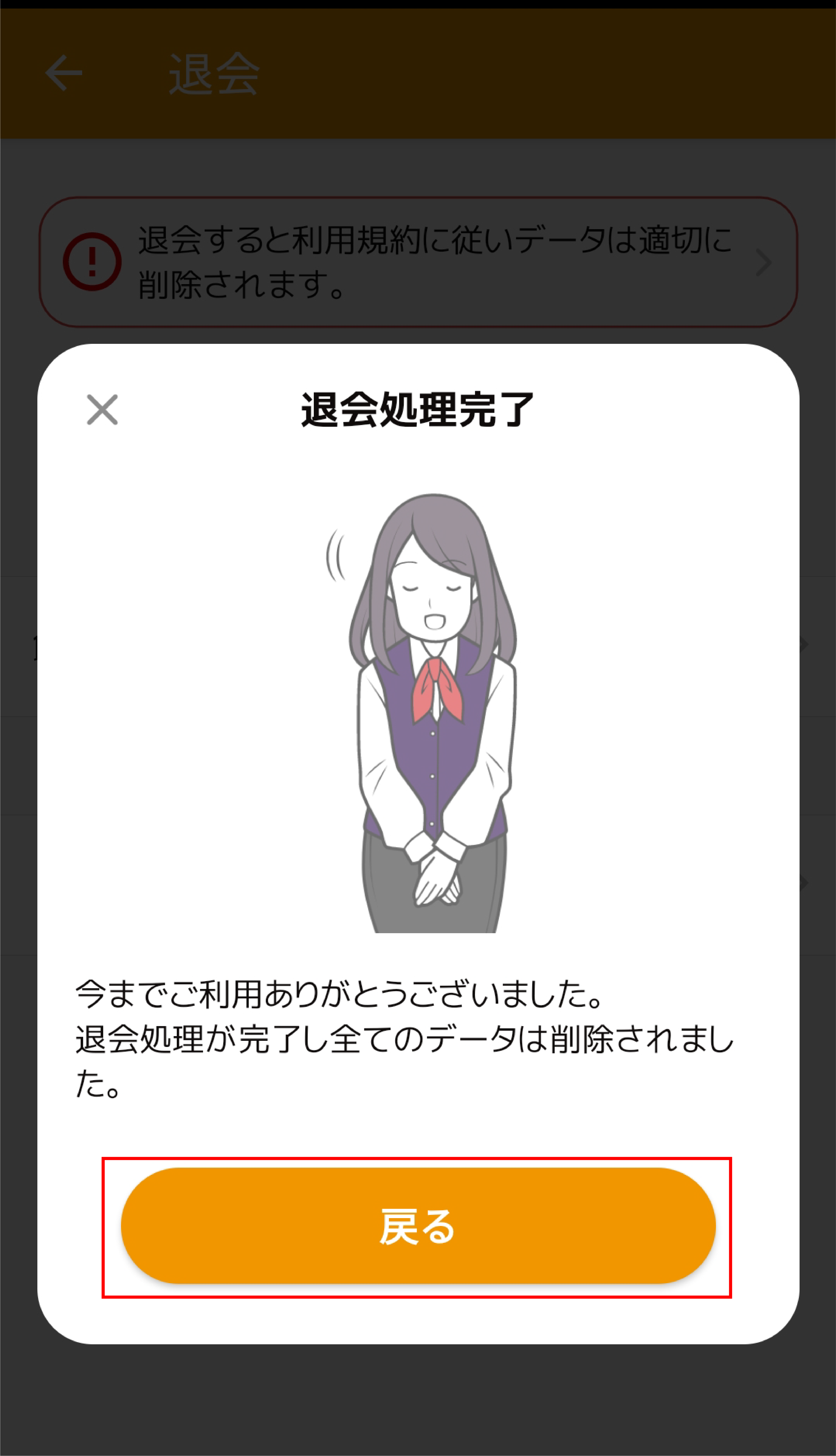 退会処理完了画面が表示されたら「戻る」をタップします。